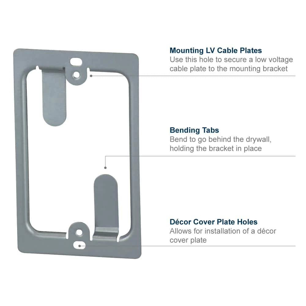 Commercial Electric’s 1-Gang Low-Voltage Mounting Brackets are used for Low-Voltage retrofit work, providing the ability to install single-Gang (1-Gang) wall plates without a back box. These easy to install brackets provide the versatility for all of your Low-Voltage installation needs. Brackets are for use with Low-Voltage Class 2 only.