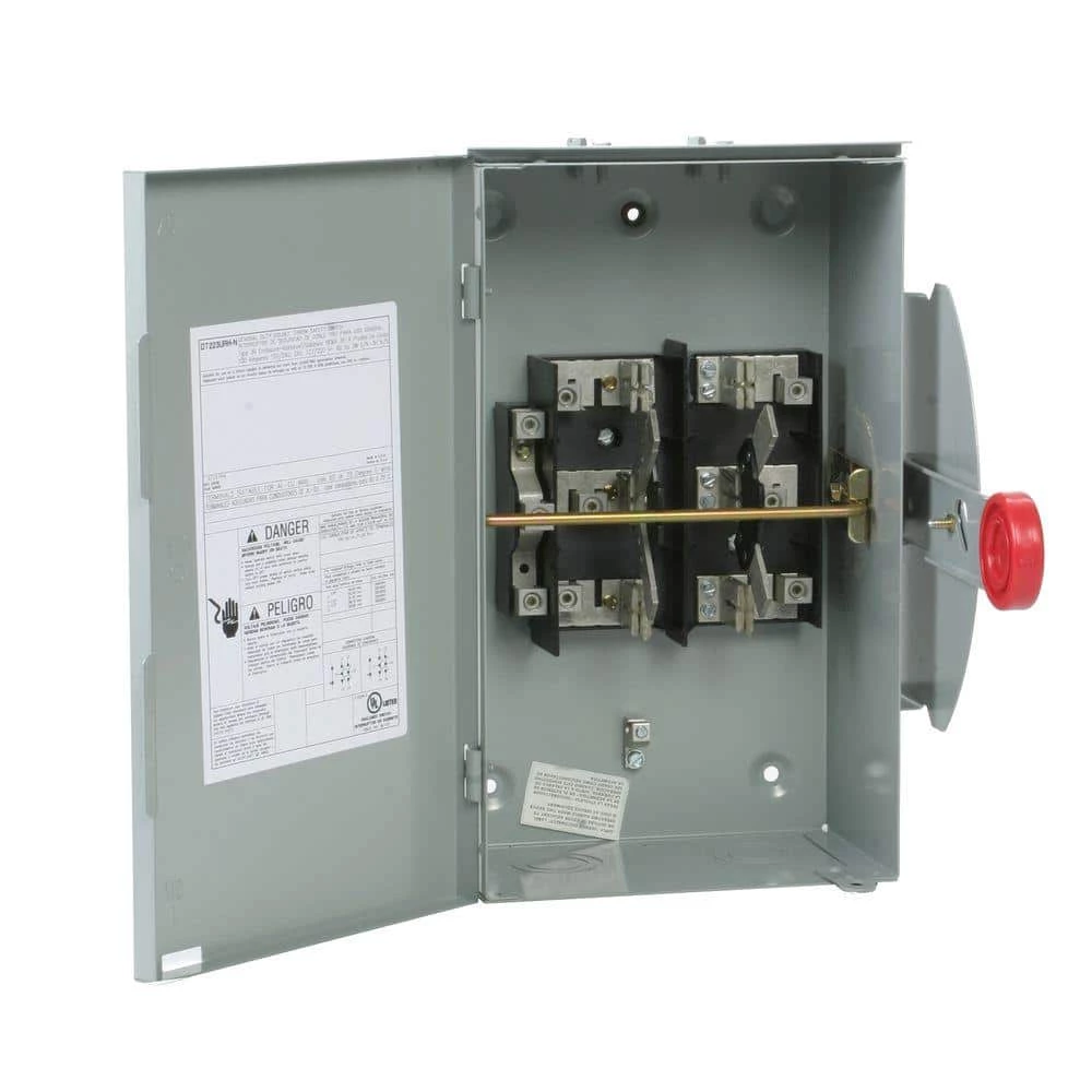 Non-fusible safety switches provide a means to manually connect or disconnect the load from the source. The Eaton 100 Amp 120/240-Volt 24,000-Watt Non-Fused General-Duty Double-Throw Safety Switch has a rainproof, metallic case that is approved for outdoor use. The unit is ANSI certified and UL listed with a single phase and double throw. The switch is intended to open or close an electrical circuit in general-duty applications.