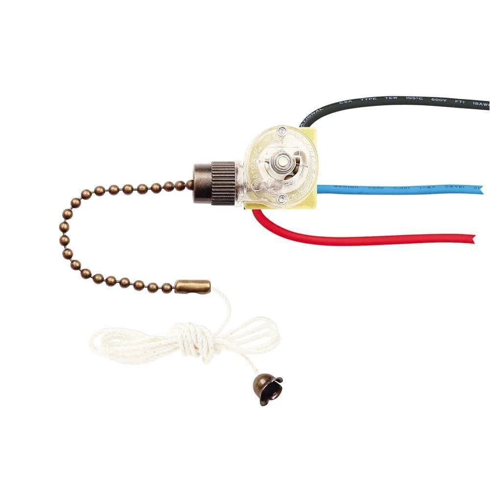 The 3-Way Fan Light Switch offers an affordable alternative to replacing your existing ceiling fan. The 3 wires allow you to control lighting options to suit your individual needs. The antique brass finish beaded pull chain brings a distinguished look to your decor and allows for easy manual operation.