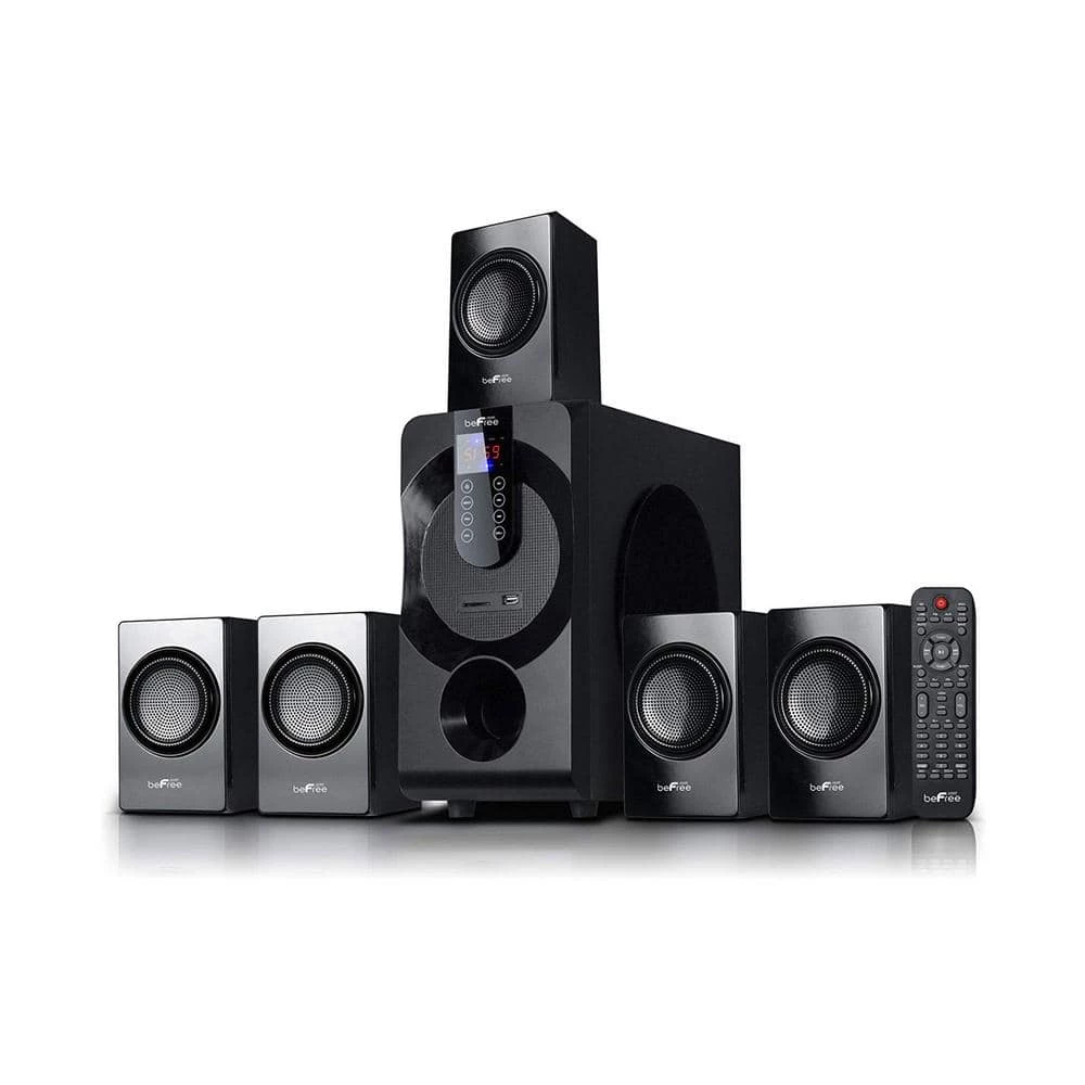 Enjoy the ultimate home theater experience with BEFREE SOUND’S 5.1-Channel Surround Sound Bluetooth Speaker System. This speaker system is designed with sophistication, featuring a sleek look and smooth sound. With Bluetooth, USB, SD and FM radio capability, the system offers the best possible listening options for your enjoyment.