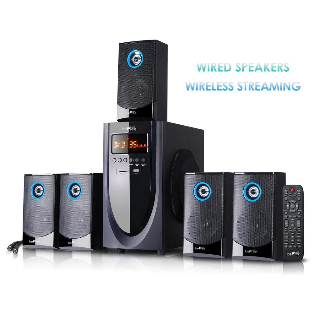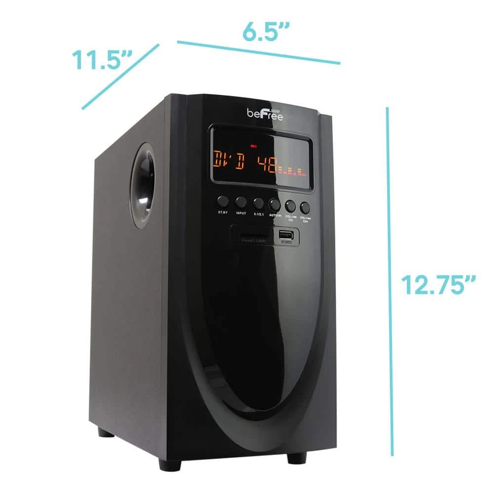 Enjoy the ultimate home theater experience with BEFREE SOUND’S 5.1-Channel Surround Sound Bluetooth Speaker System. This speaker system is designed with sophistication, featuring a sleek look and smooth sound. With Bluetooth, USB, SD and FM radio capability, the system offers the best possible listening options for your enjoyment.