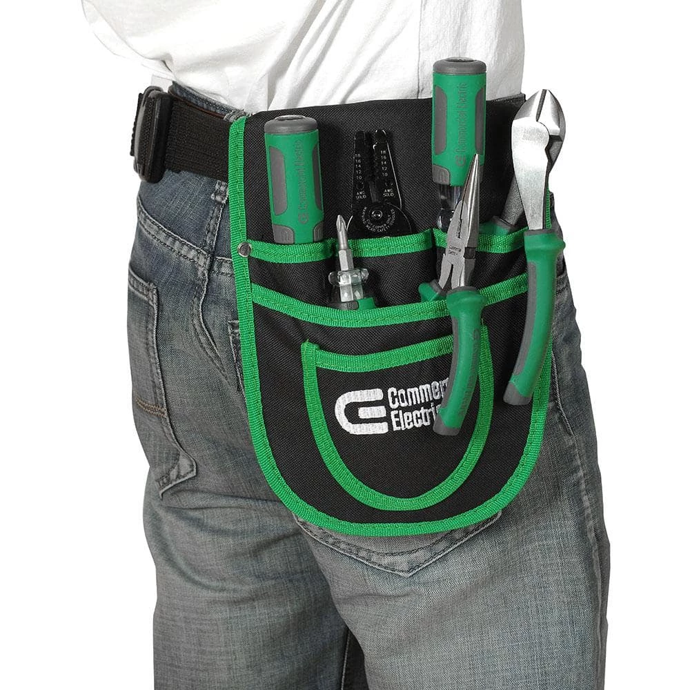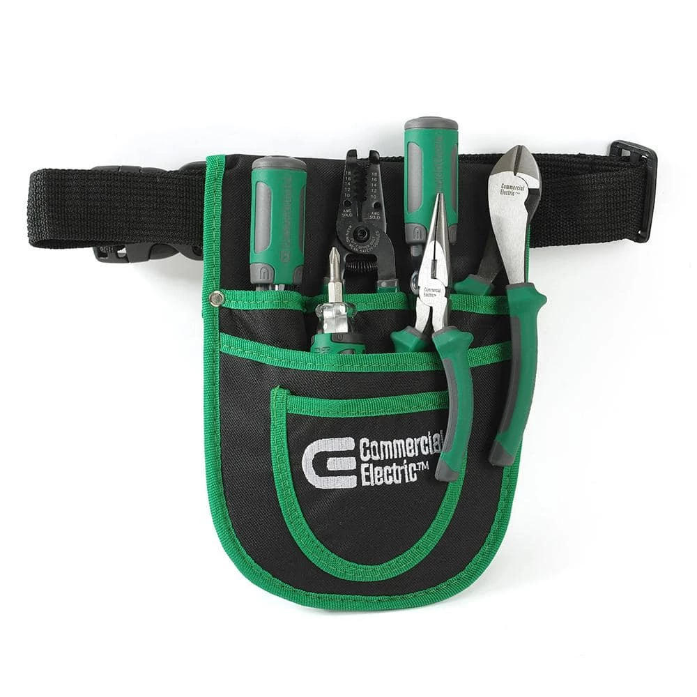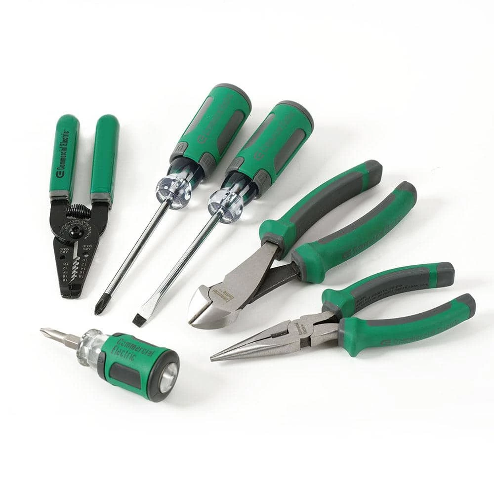 The Commercial Electric 7-Piece Electrician’s Tool Set is a great assortment of electrical tools perfect for the home, workshop or jobsite. Contents include 7 in. diagonal wire cutting plier, 6 in. long nose plier, 1/4 in. x 4 in. screwdriver, PH2 x 4 in. screwdriver, 2 in 1 stubby screwdriver and 6 in. solid wire stripper. Each plier features heat-treated steel with induction hardened cutting edges. Anti-slip grip handles provide comfort during use. This set also includes a convenient tool pouch, with 6 pockets to organize electrical tools and a tool belt.