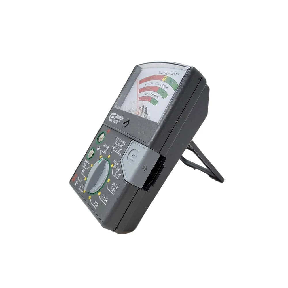 Safely learn the remaining strength of battery by using the Commercial Electric Battery Tester ABT-602R. This battery tester features a dial knob that easily selects the type of battery you need to measure. The tester also features nickel battery measure slot and 9-Volt battery terminal.