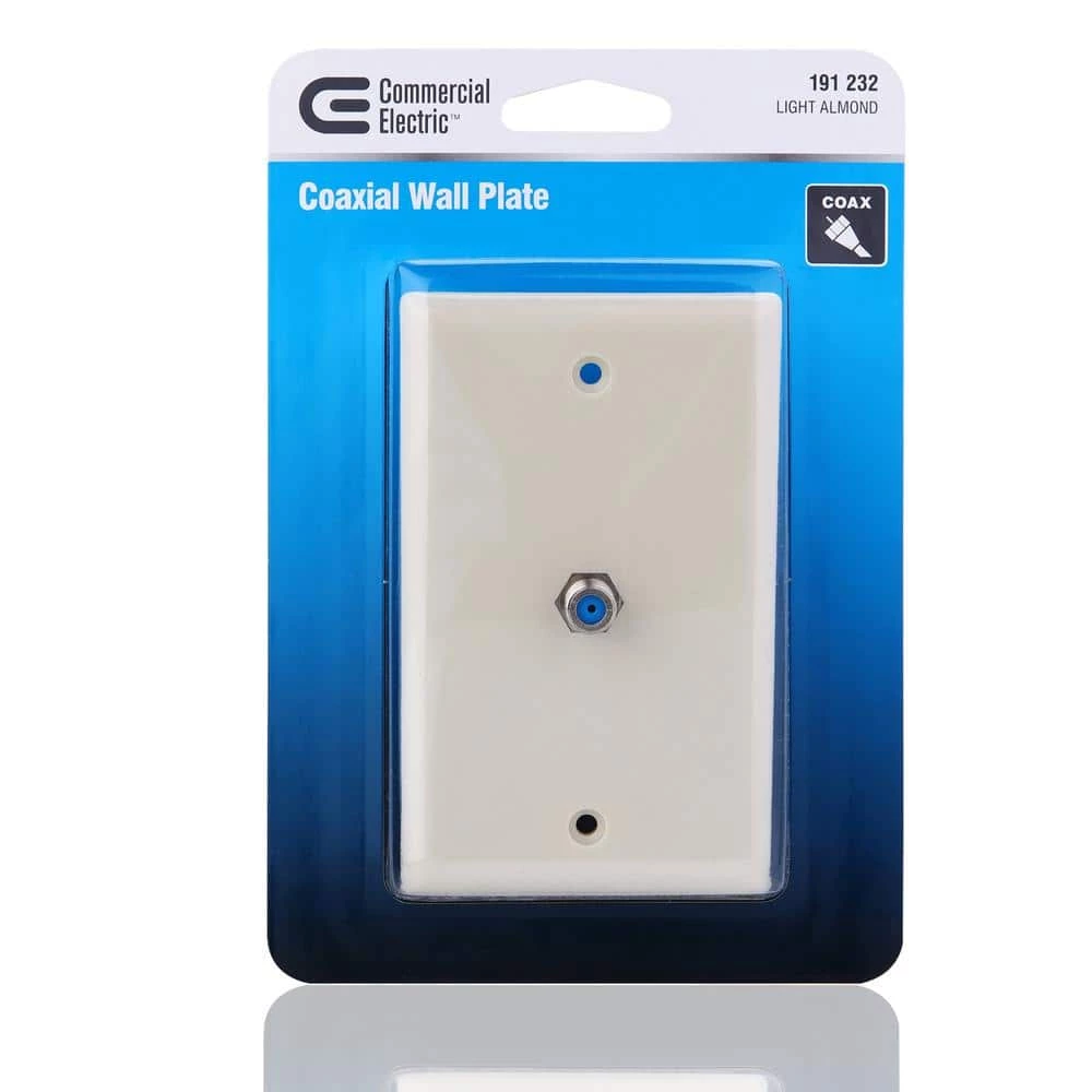 Install a coaxial cable into a wall in seconds with this Coaxial Cable Wall Plate from Commercial Electric. 1-line plate accommodates coaxial cable (not included) for carrying video and sound with low signal loss. Plate has unique light almond finish.
