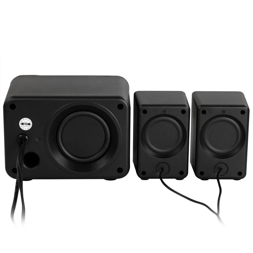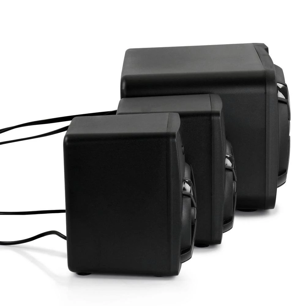 Immerse yourself into gameplay or relax with some casual downtime with this set up, with a high quality dual speaker and subwoofer and colorful LED accent lights, every moment is felt and heard. Compact size is perfect for your desk top, designed with a sleek matte finish and boxy shape. Rotary dials control volume, treble and bas. Set comes with 2-speakers, 1 subwoofer and 1 split AUX and USB power cord.