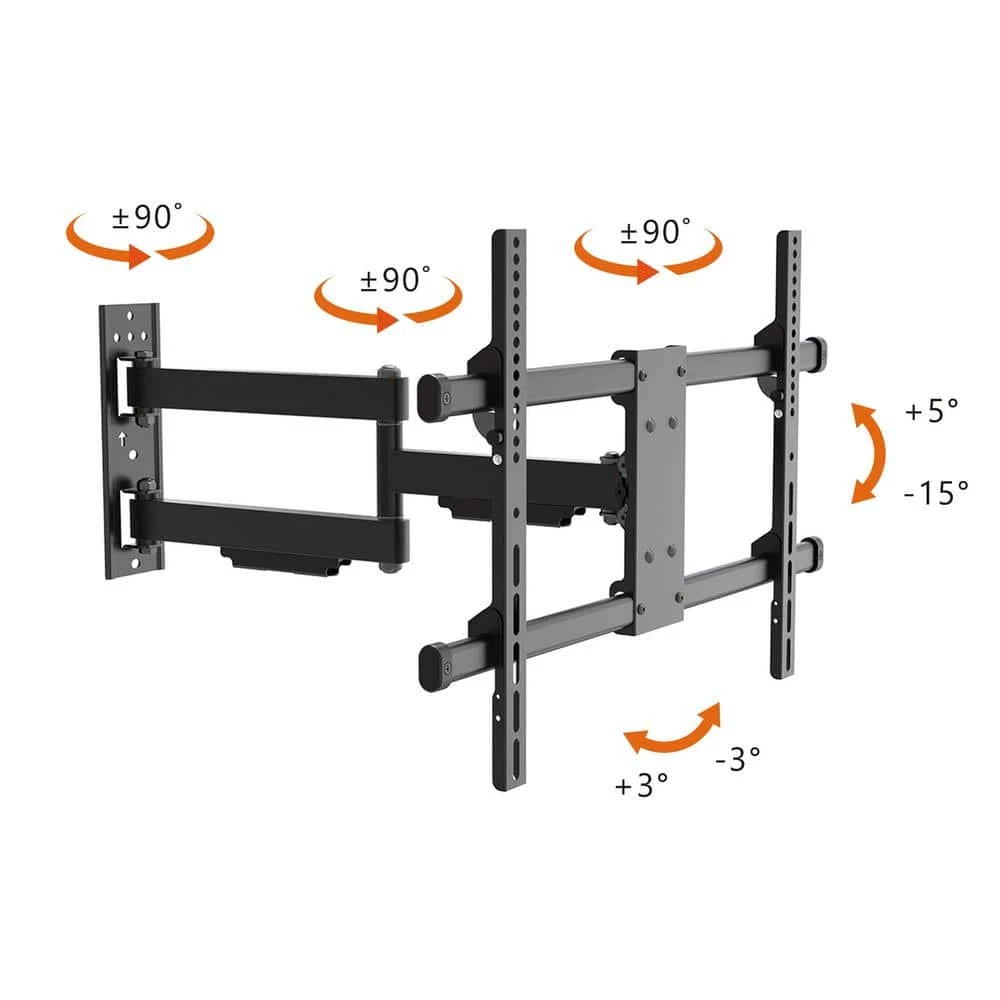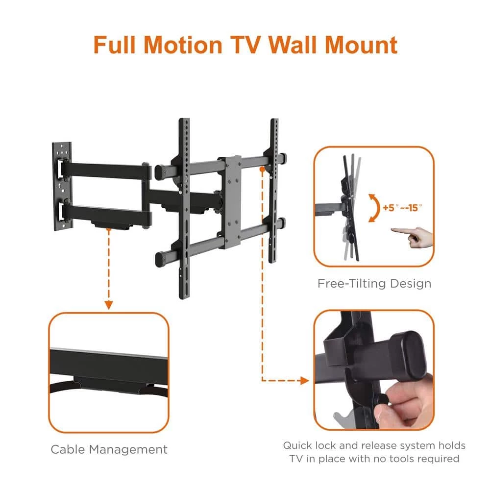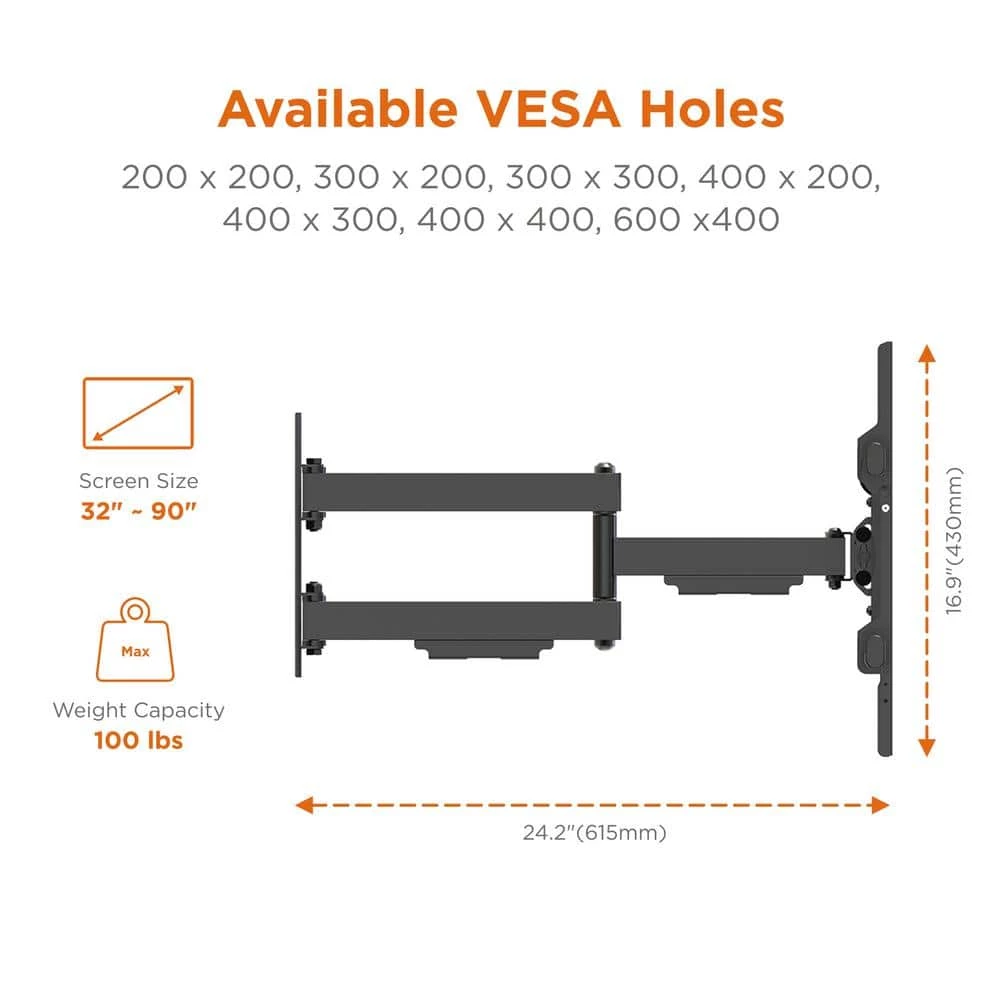 The new solid large full motion mount is constructed with high gauge steel that designed for most 32 in. to 90 in. flat panel TVs up to 100 lbs. This mount allows you to have your flat panel TV tilted for glare control or optimum viewing angle, pulled out from the wall 24.2 in. and angled towards a separate viewing area. This pre-assembled arm comes complete with integrated cable management and decorative covers to ensure an elegant and tidy look. Compatible with VESA hole up to 600/400.